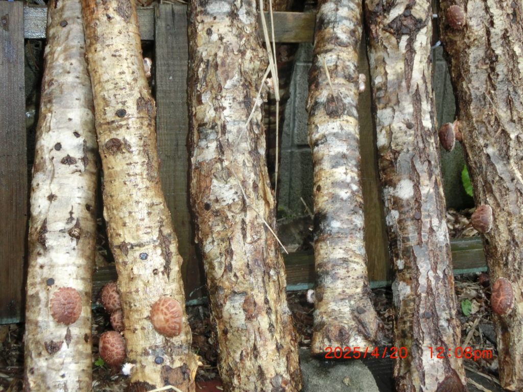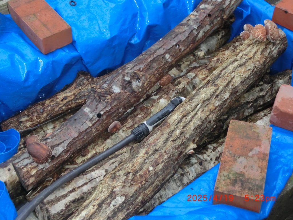 4月15日 毎日気温上昇中!今日は23度になった。しいたけに水をかけたら、しいたけがあちこちから出てきました。温暖化もここまで来ると心配です。