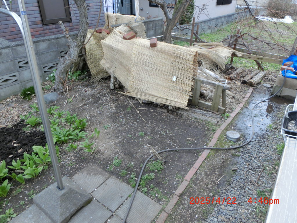 4月22日 今日は久しぶりに晴れましたので、札幌での木彫り教室の後に自宅の畑を起こしたり、シイタケを立てかけたりしました。