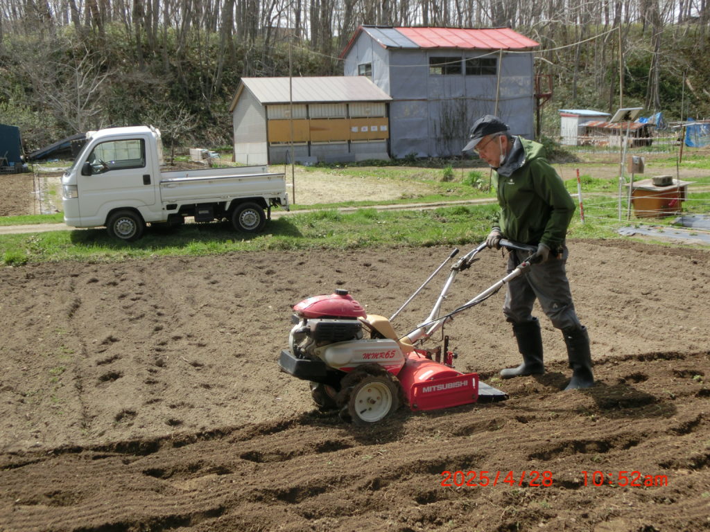4月25日 今朝は裏の畑(Mさん)を耕運機で起こしました。僕は忙しくて作付けできませんが、80代半ばの方ですので、起こしてあげましたが、雑草の根がはびこっていて、かなり苦労しましたね。何とか雨が降る前に終わりました。3年ぶりに耕運機が活躍しましたね。