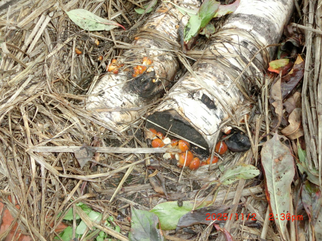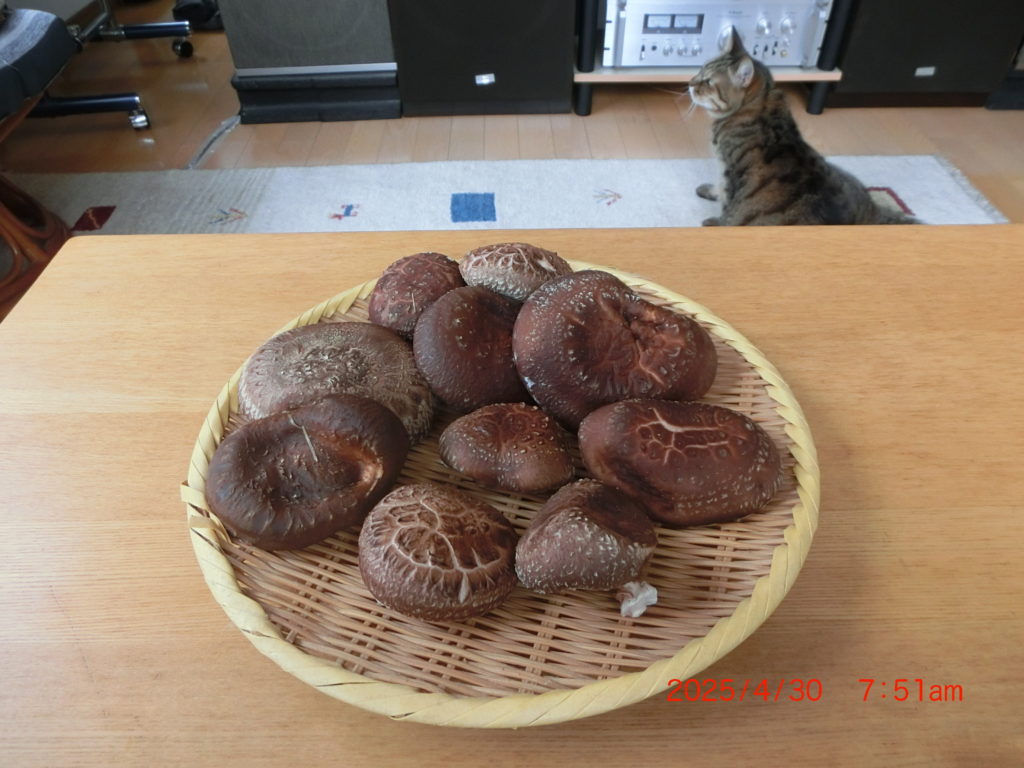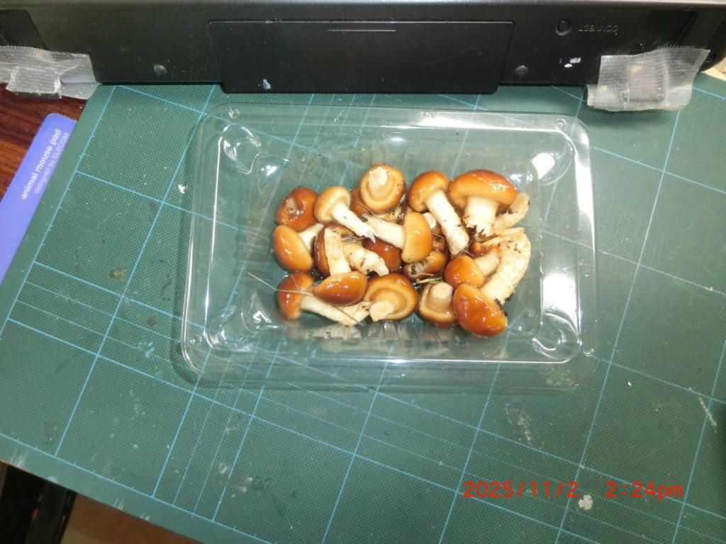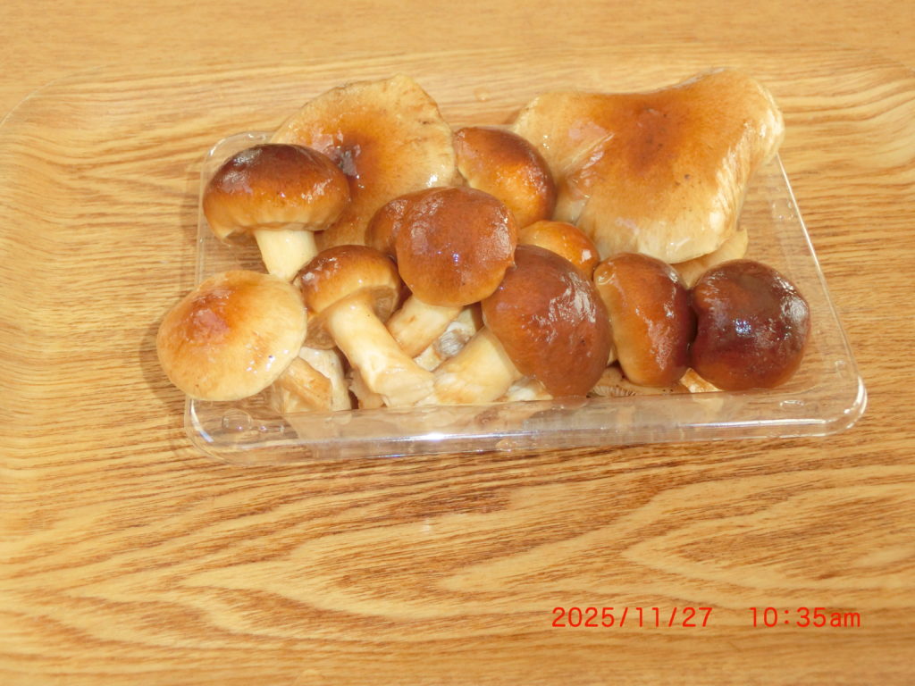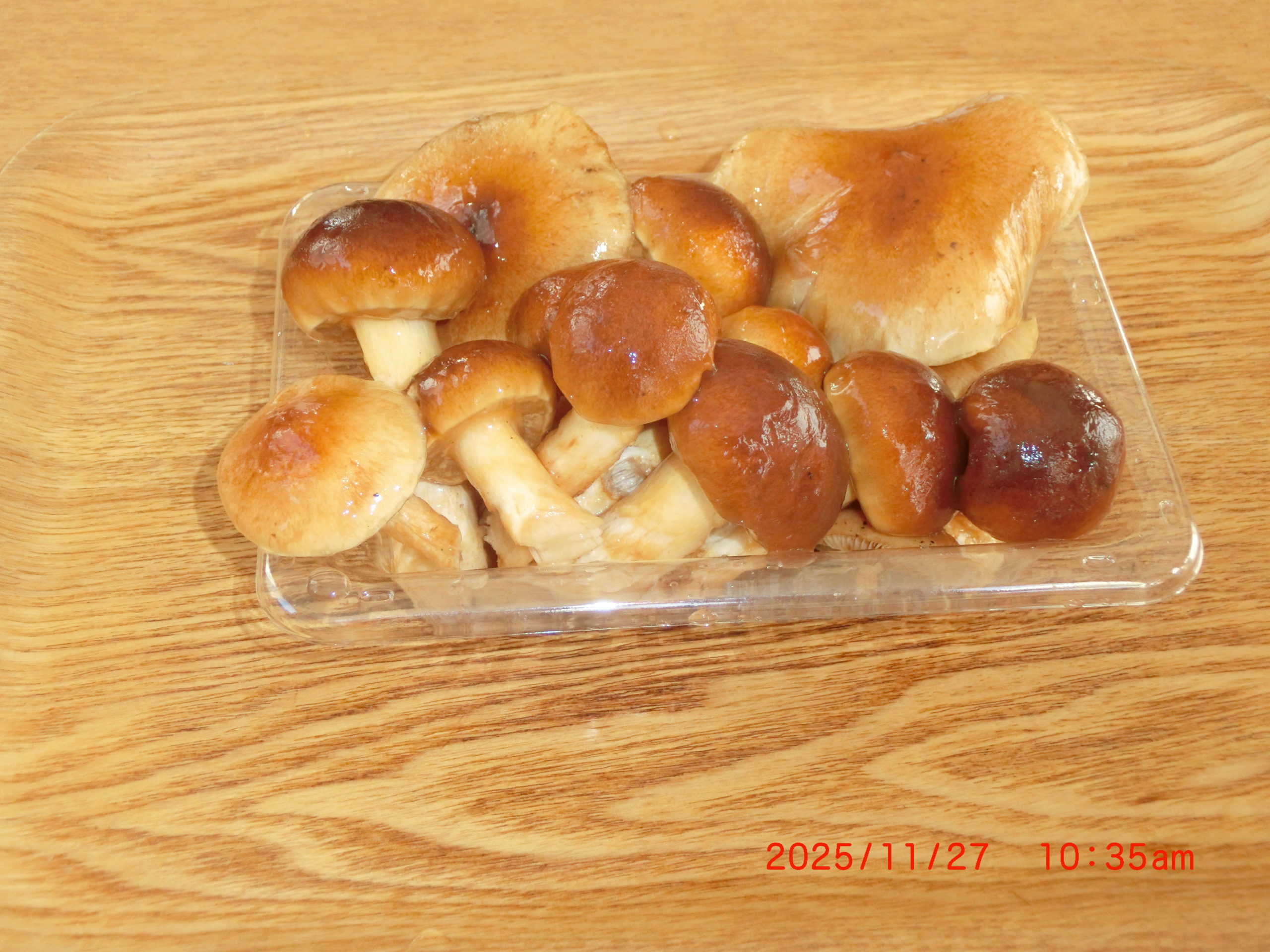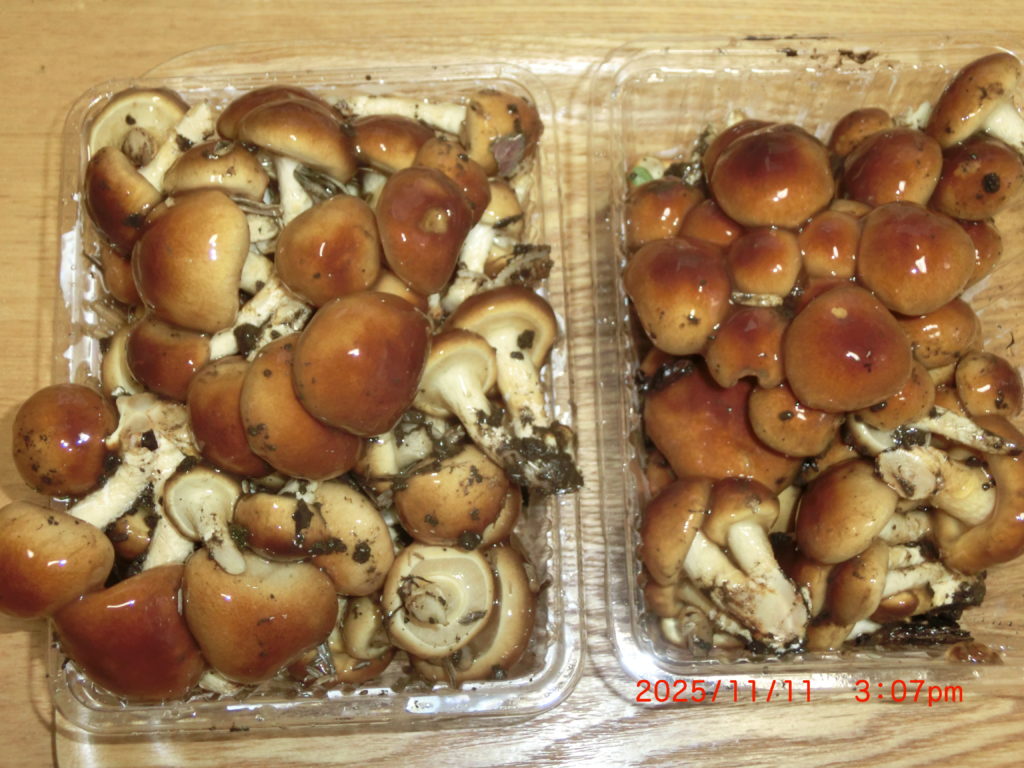 11月2日 最近はドジャースの野球の試合に時間を取られてしまって、今日ようやく優勝していつもの生活に戻れます。野球フアンでもなかったのですが、今年は特別感があります。日本選手の活躍に目が離せなくなりました。試合が終わってから、畑のなめこの状態を見に行きました。ようやく少しとれるようになりました。今年は白樺の木から少しずつ出てきていますし、ミズナラの木からも出てきています。きっと雨が多かったのが影響していますね。これからの季節に期待しています。今年は2日おきぐらいに水を掛けたり、むしろを掛けたりしてきましたので、その影響かな。わさーっと出てきてほしいのですけど、季節のせいか大きくなりません。シイタケを見てみたら、1個だけ巨大なのがありましたので、晩御飯に使いました。