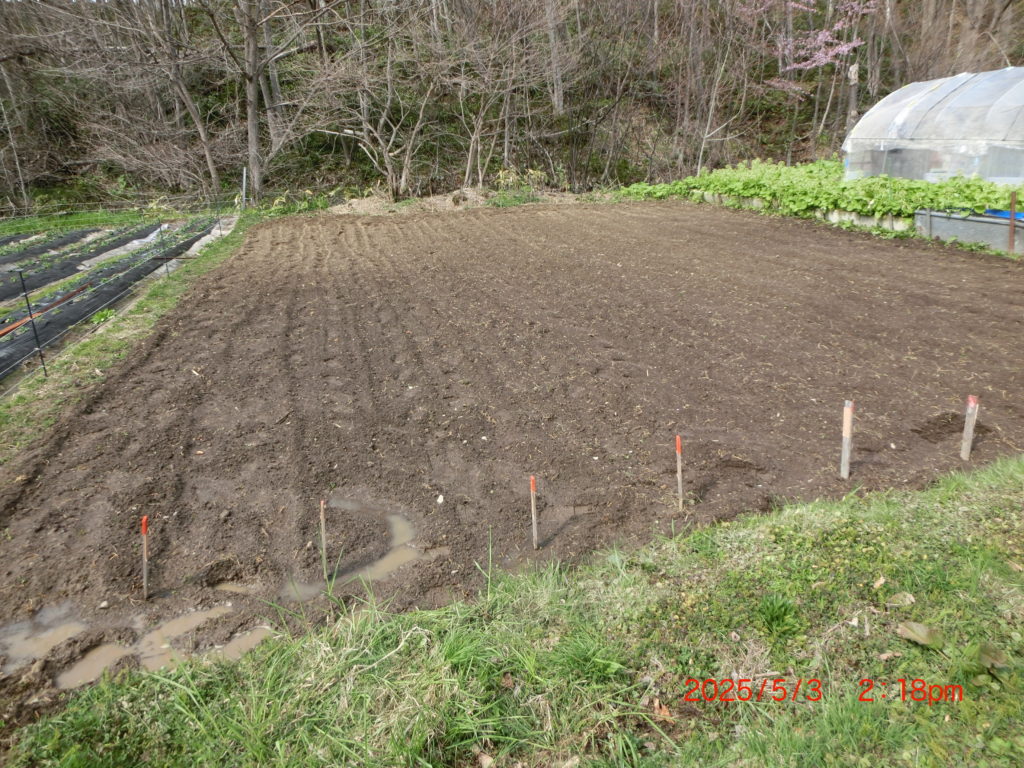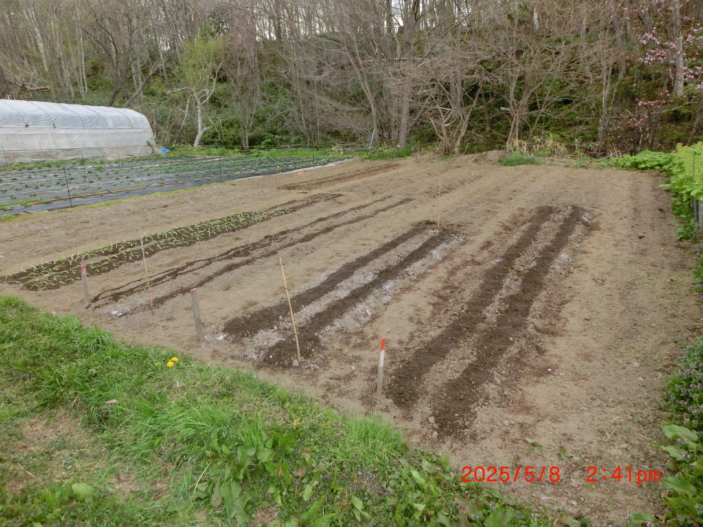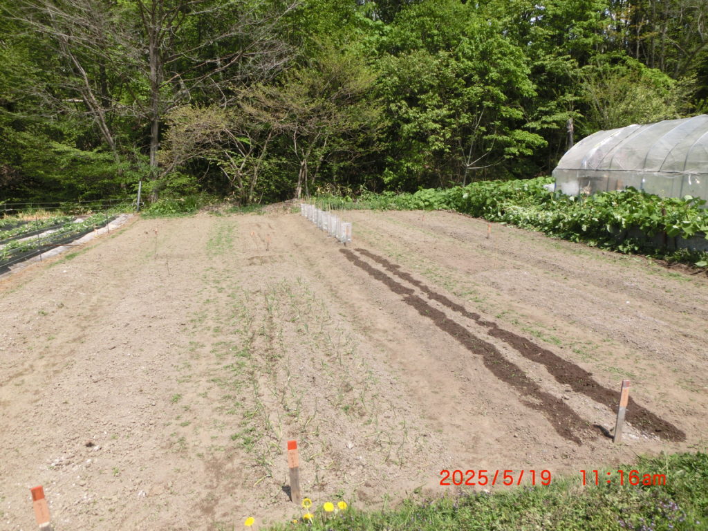 5月7日 今日は北広の畑をようやく一部作付けできました。雨が多かったせいか、畑が水につかり、耕起できない状態が続きましたが、6日ようやく耕運機が入り、今日は一部ですが、ジャガイモと玉ねぎを植えました。玉ねぎはまとまった苗でしたので、上部を切って植えることにしました。肥料と石灰は同時に投入。時間をおければよかったのですが、今のうちに植えておきたかったので、植えることにしました。昨日はほかの仲間たちも一斉に耕運機を動かして畑仕事再開です。僕は今年は耕運機が動いたので、久しぶりに畝幅を広げて、さらに間に耕運機が入れるように計画します。雑草取りでは2年間苦労したので、昨日も細かい雑草の根を取るのに時間をかけました。座ったり、立ったりの繰り返しで、体に負担がかかりますが、仕方がない時間でしたね。