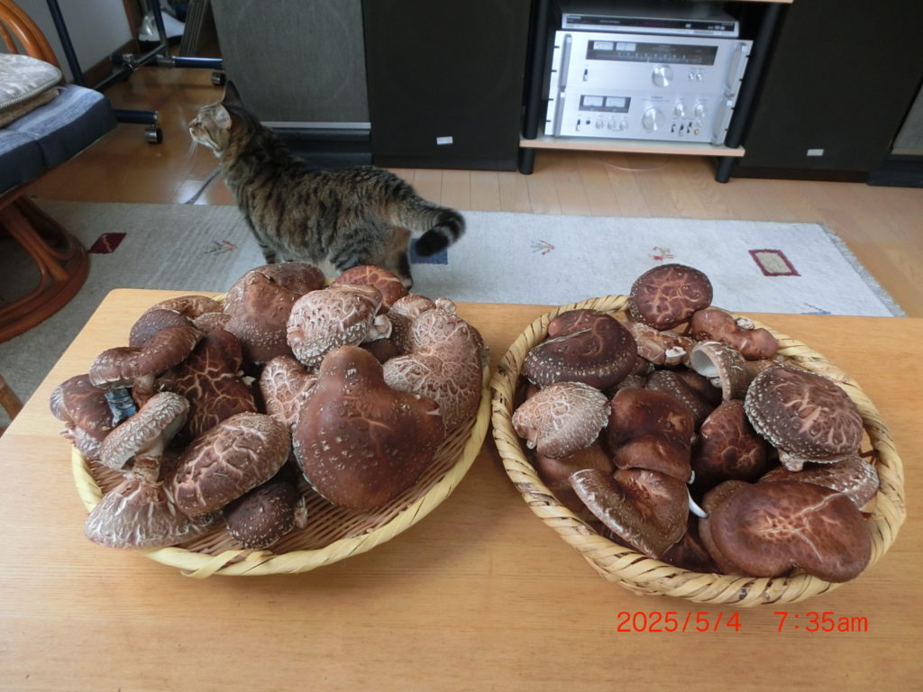 5月4日 今朝はシイタケが大量に採れました(50個)ので、ご近所に差し上げました。昨日は北広の畑に行きましたが、雨でぬかる状態でしたので、少し計測して棒を立てただけで帰ってきました。