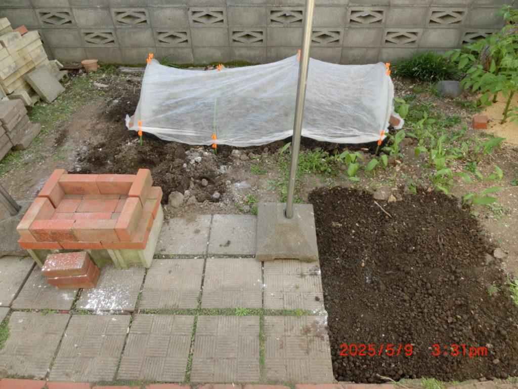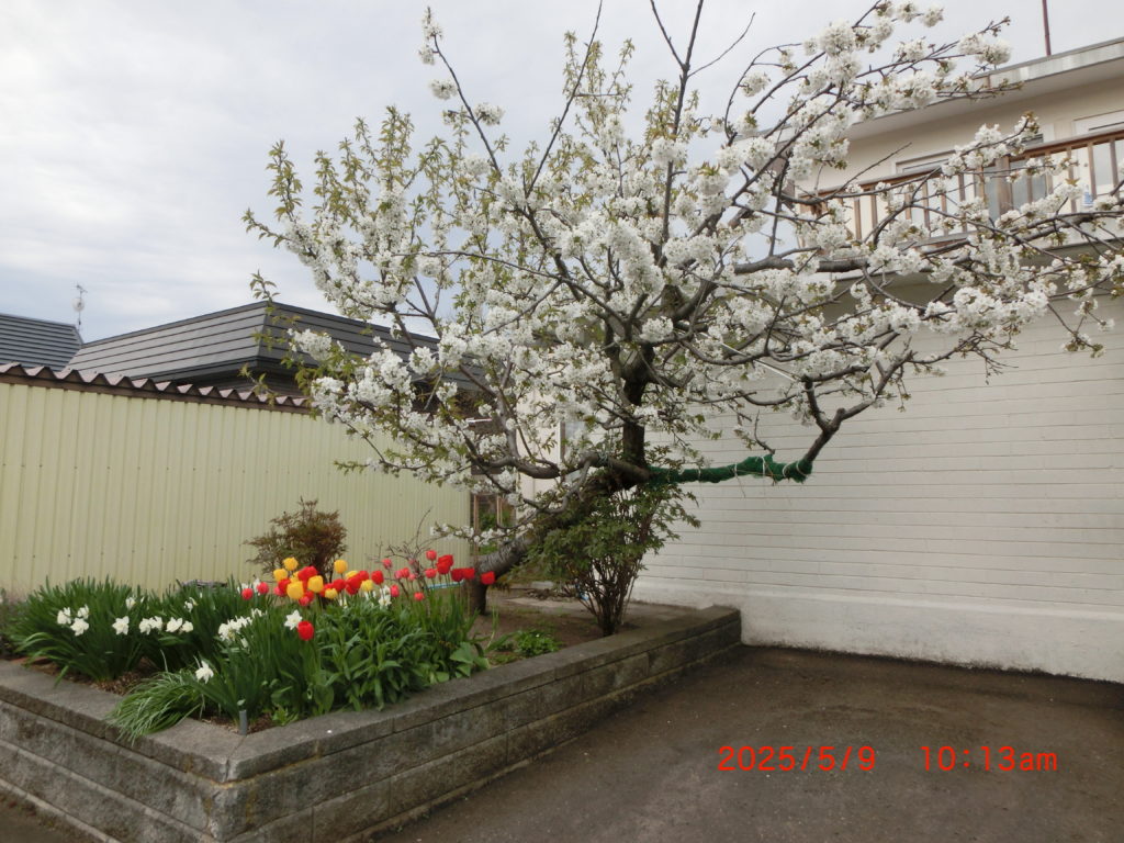 5月9日 サクランボの木です。庭木ですが、実がなります。今が満開です、でもすぐに殺虫剤を少しかけないといけないです。自宅の箱庭には苗ものを少し植えました。不織布をかけて寒さ対策です。カブはたくさん食べたいですね。大根は少しだけでいいです。焼肉コーナーも作りました。お隣さんは、いよいよビニールハウスを建てるそうです。お手伝いをすることになりそうですね。そうそう、昨日は今年初めて庭のウドを食べましたが、北広の畑の人が言っていたことを思い出しました。「ウドをいくら畑に植えても野生のものとは比べようもない」そうで、自宅のウドも野性味がないような。でも柔らかくてとてもおいしかったな。