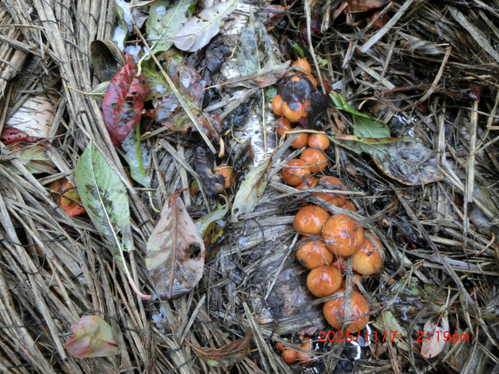 11月19日 今朝はなめこ汁用に収穫しました。ミミズが少し食べていました。雨がよく降るのでなめこも少し出てきました。その後24日に少しナメコを収穫。25日に雪が降って今年のナメコは強制終了です。