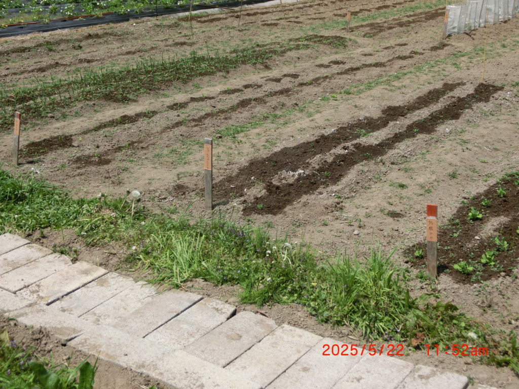 21日は久しぶりに雨です。トウキビや枝豆、ジャガイモ、モロッコ、絹サヤ、スナップ、はようやく伸びてきそうです。先日買ってきたイチゴは少しでしたので、自宅裏の畑に植えました。秋には北広の畑に植えます。(5.21)
