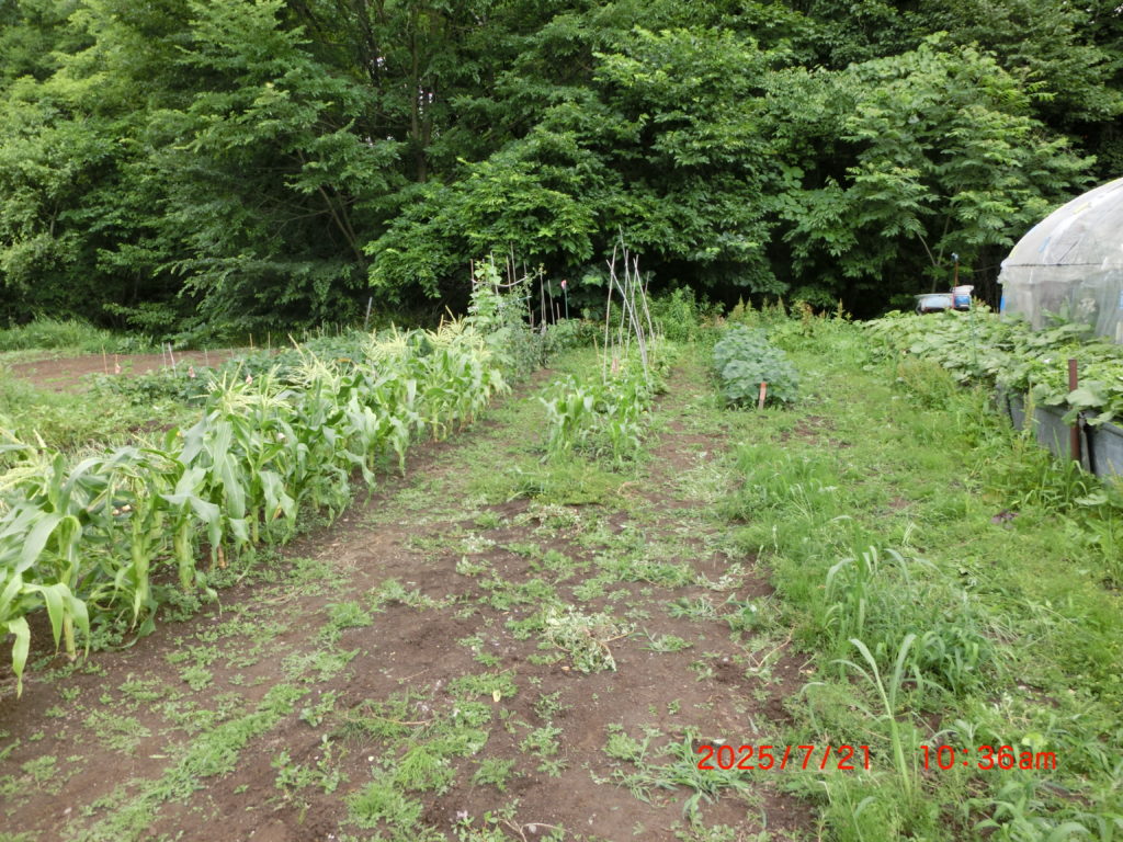 7月17日 まさに灼熱地獄!絹サヤ・スナップ・ジャガイモなどの収穫と水やりだけをして帰ってきました。夜には会議がありました。トウキビはできてくると、またアライグマの心配です。玉ねぎは実がついて来ました。手前は枝豆ですが、まだまだですね。