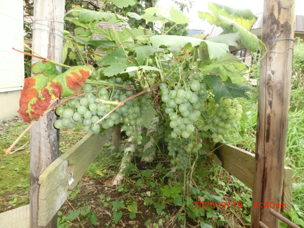 9月18日 今朝はブドウを一房収穫してみました。いつもの年より実が大きく、甘さも良いですね。9月26日には毎朝食のブドウは甘くなってきています。