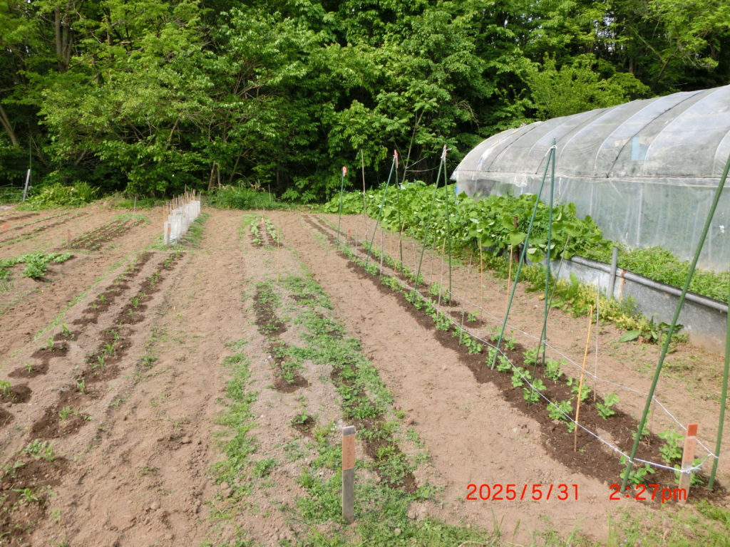 5月28日 今日はよく晴れたので、北広島の畑に行きました。植えた豆類の芽が良く出てきました。スナップエンドウだけがいまいちの伸びです。今日はあちこち水をいっぱいかけました。次回は耕運機を持ってきて、除草をします。
