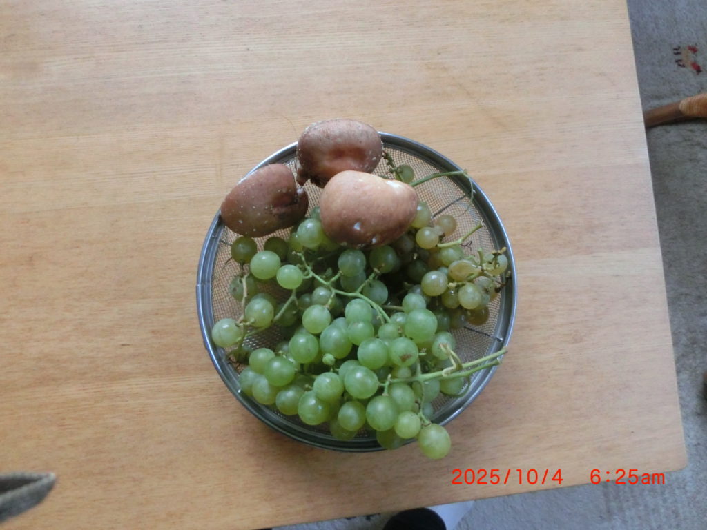 10月4日 我が家のブドウが収穫時期を終えそうですので、今朝は少し多めに収穫しました。シイタケはもはやあまり出てきませんが。ブドウの色が黄色くなってきました。おいしいのですけど、鳥がつついた後もあります。今年最後の収穫ですね。