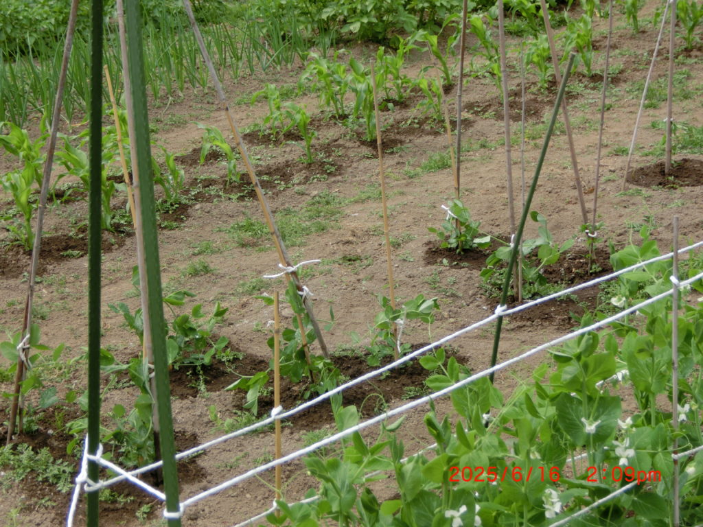 6月16日 北広の畑です。スナップエンドウはいつもながらよくできてきません。手前の絹さやは毎年よくできます。モロッコや枝豆はよくできます。自宅に植えたトマトなどは少し木を切って光が入るようになって、改善されましたね。