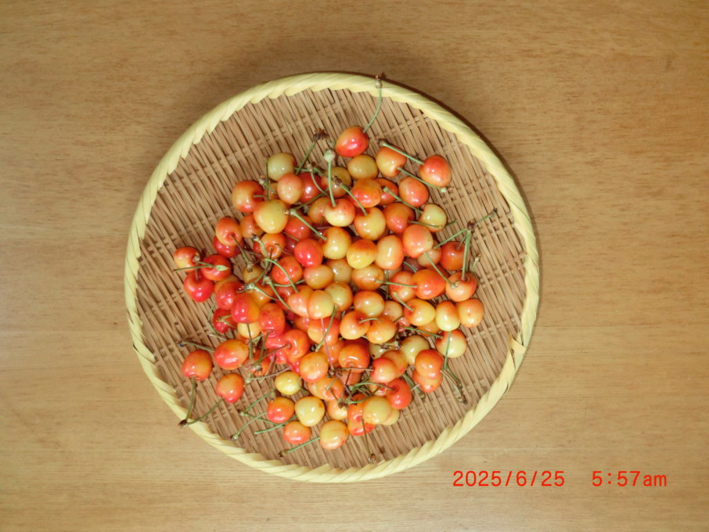6月25日 最近朝5時になるとカラスが近くで鳴くので、今朝は5時からサクランボの収穫をしました。と言っても今年は実りが良くない。欲しがる人がいるので、少しだけ収穫しました。本当はもう少し赤くなるのを待ってから収穫と行きたいところですが、4~5羽来るとすぐなくなるので。今朝は病院に行く日なので急ぎました。