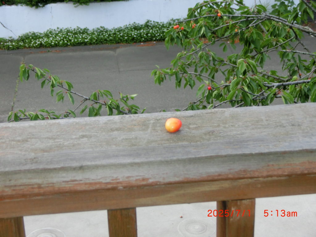 7月1日 今朝はなぜかサクランボ1個がベランダに。最近はカラスが来ても特に何もしないでいます。自宅では食べきれないし、実が少しずつ腐り始めていました。日曜日には教会の皆さんに食べてもらいました。3回ほどバケツ一杯収穫しました。カラスが食べて残していったみたいですね。軽トラの上にも食べた種が残っています。リスもサクランボを食べたり、埋めたりしていましたね。今朝は2時間ほど北広の畑に行きました。絹さやを収穫したり、キュウリを2本収穫。あとは水やりです。干上がってきましたので、水が不足しましたね。暑くて作業はほどほどにして帰ってきました。北海道が30度超え。すごい時代になりました。