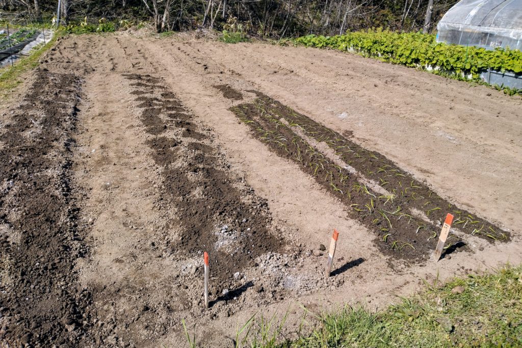 5月2日北広の畑 玉ねぎの苗はすべて植え終わりました。その後はとうきび、枝豆用に肥料や石灰を撒きました。まだまだたくさんの仕事が残っています。