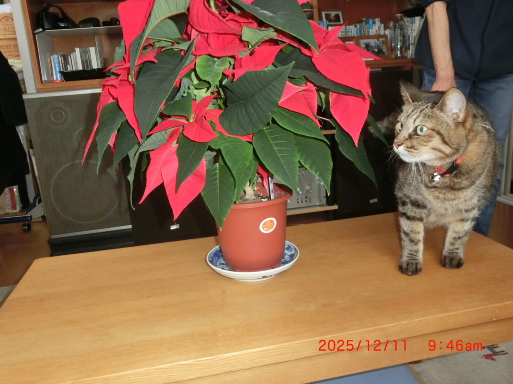 12月10日 今年も立派なポインセチアをいただきました。飛谷先生ありがとう。ちょうど東地区センターで江別市の方と打ち合わせをしていましたので、お会いできず、残念でした。スモモも興味津々です。先生とは12月27日にお会いできるので、楽しみです。札幌市北7西4第5道通ビル17時 ルンゴカーニバル札幌駅北口ですね。