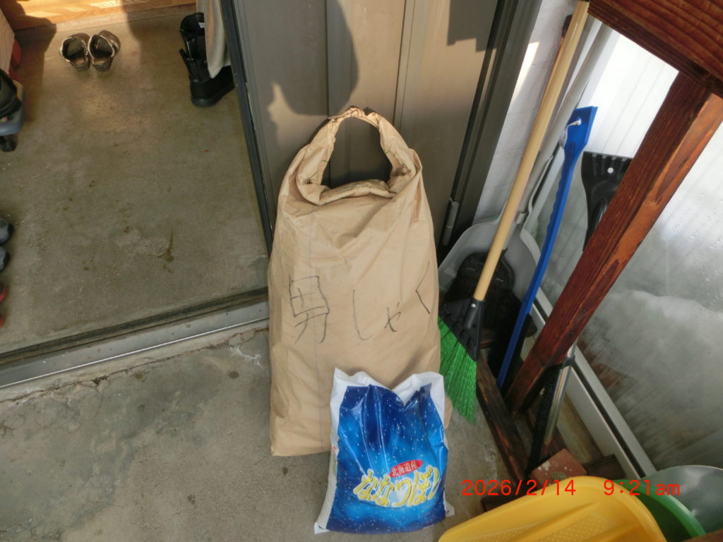 2月12日 昨日は浜益から卒業生のT山君が寄ってくれて、20kgくらいのジャガイモとお米を持ってきてくれました。どちらも今年は貴重な農産物で、大いに助かりました。男爵は大きいので玄関先で写しました。ありがとうございます。