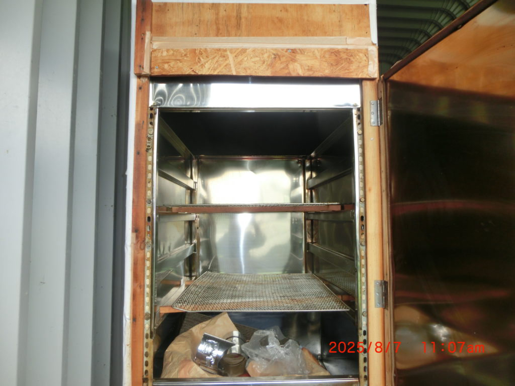 8月7日 今日はえみくるで10日に使うピザ窯の天板を作りに行きました。ついでに燻煙箱も撮影しました。グラウンド横の物置に置いてあります。米沢レンガさんのピザ窯2台は大きすぎてステンレス版を載せるのには少し苦労しました。でも4台でピザを焼くことになります。燻煙箱はしばらくの間、ベーコンを販売するのに使用していたもので、ステンレスで内装をしたもので、とても立派なものです。業者の人にお願いしました。ベーコンは30㎏が限界でした。でも今後はベーコンづくりの講習会などで使う予定です。もう少し涼しくなるまでお待ちください。販売は計画しておりません。