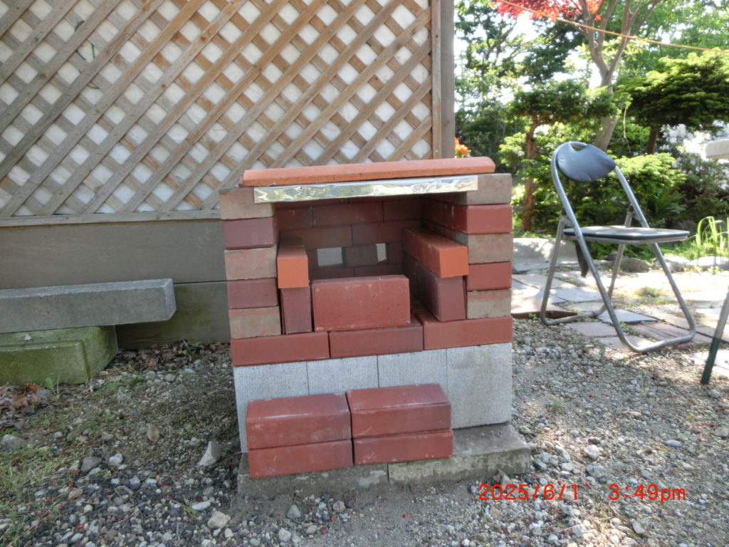 6月1日今日は土台のブロックをDCMで買ってきて、後からステンレス盤を作ってピザ窯を完成させました。レンガがいつものものと違いましたので、組み立て後の心配はありますが、何とか使っていただきたいです。耐熱版は後ろの物置にしまってあります。四角いレンガブロックは用意していなかったので、敷石代わりに設置しているレンガを抜いてこちらに使用しました。