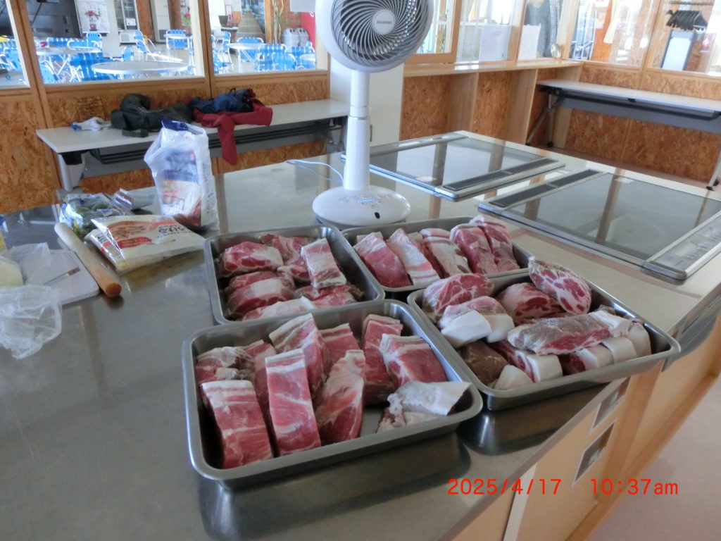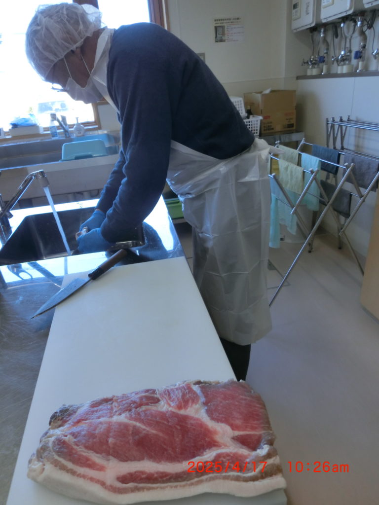 朝9時には豚肉を水洗いして、塩分などを軽く洗い流して、乾燥しました。