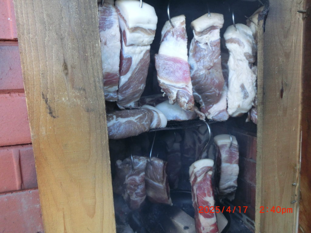 4月18日 昨日はバイクを軽トラに積んだままになっているので、今日は何とかしてバイク屋に持っていきたいですね。久しぶりのベーコンづくりに一日を費やしました。今後は同時のピザづくりはしないほうが良いことも学びましたね。晩酌にはおいしいベーコンを食べました。燻煙箱は6kgが限界だということも学びましたね。今回は扇風機を2台にしましたので、よく乾燥できました。また、しっかり殺菌をしておく(1週間)と、冷凍保存して解凍すると、そのまま食べることができますね。比較的生感覚で仕上げることによって、少しの間ですが、おいしく食べることができることが分かりましたね。もちろん自分だけの楽しみですけどね。(秘密です)