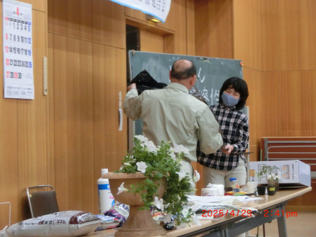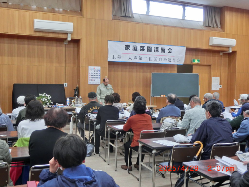 4月29日 今日は3年目になる第二住区自治連理事(あぐりパートナーズ代表)の津田雄二さんによる「楽しい畑づくり」講演会がありました。85名集まりました。ゴールデンウイーク中で、雨が降って寒い中皆さん集まってくれました。アシスタントもついて津田先生のお話も実演付きでトーンが高まりますね。