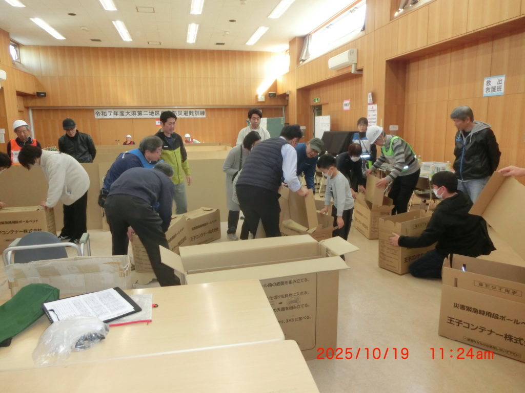 10月20日 今日は大麻第二住区自治連合会主催の自主防災避難訓練を行いました。地域の方が約80名集まり、朝8時頃から12時までの4時間にわたってマグニチュード7の直下型地震が発生したとの想定での避難訓練です。10時からは全員でAEDの使い方や段ボールベッドの作り方、さらに消火活動などの実施訓練をしました。本当の災害発生時にどれだけ訓練の成果ができるかわかりませんが、日頃より災害時に対する備えをしていると今日の訓練を思い出す確率は高くなると思います。