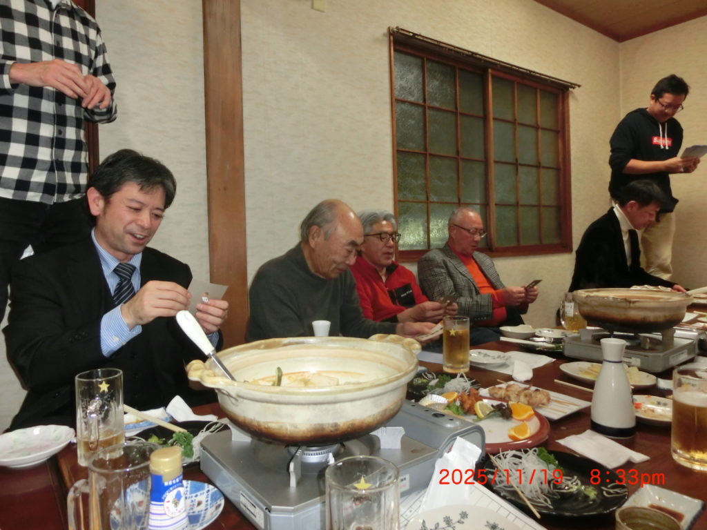 11月19日 今日も大麻自治連と大麻消防関係者との懇親会です。消防の方には若い人達もおられるので、かなり勢いがありましたね。ビンゴゲームなどもありました。いつも辺境地にいる我々も写真に納まりました。ま、中心にいない気楽さもありますけどね。でももはや畳はきついな。