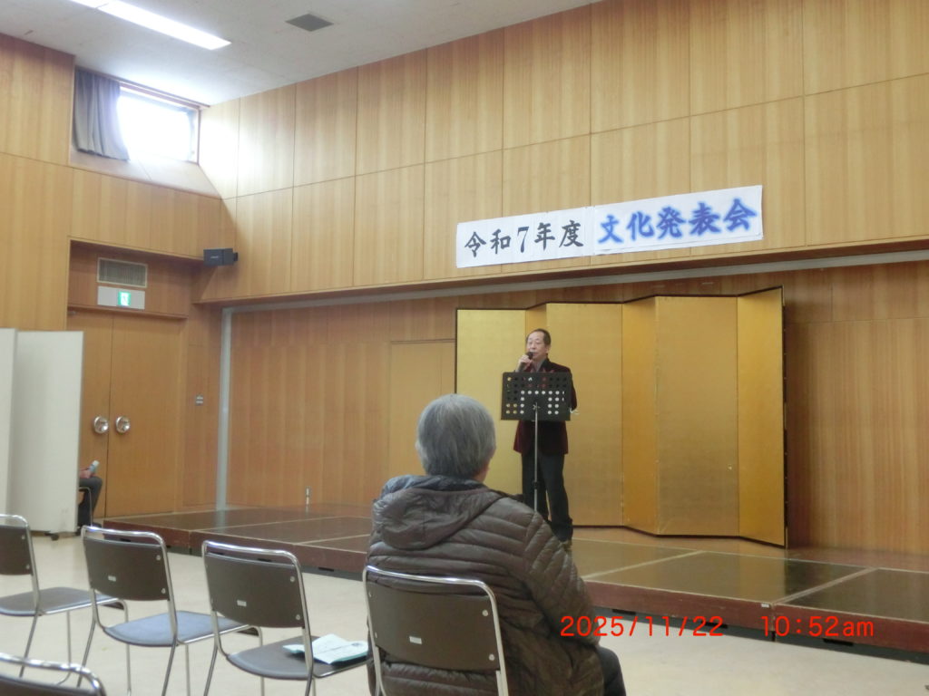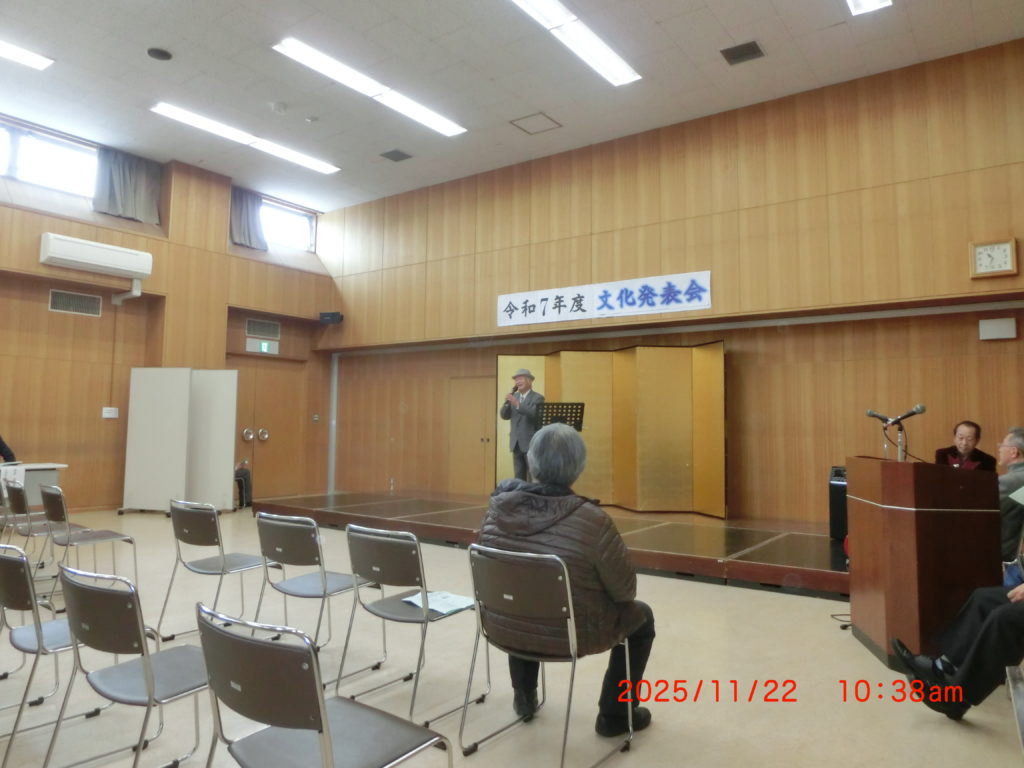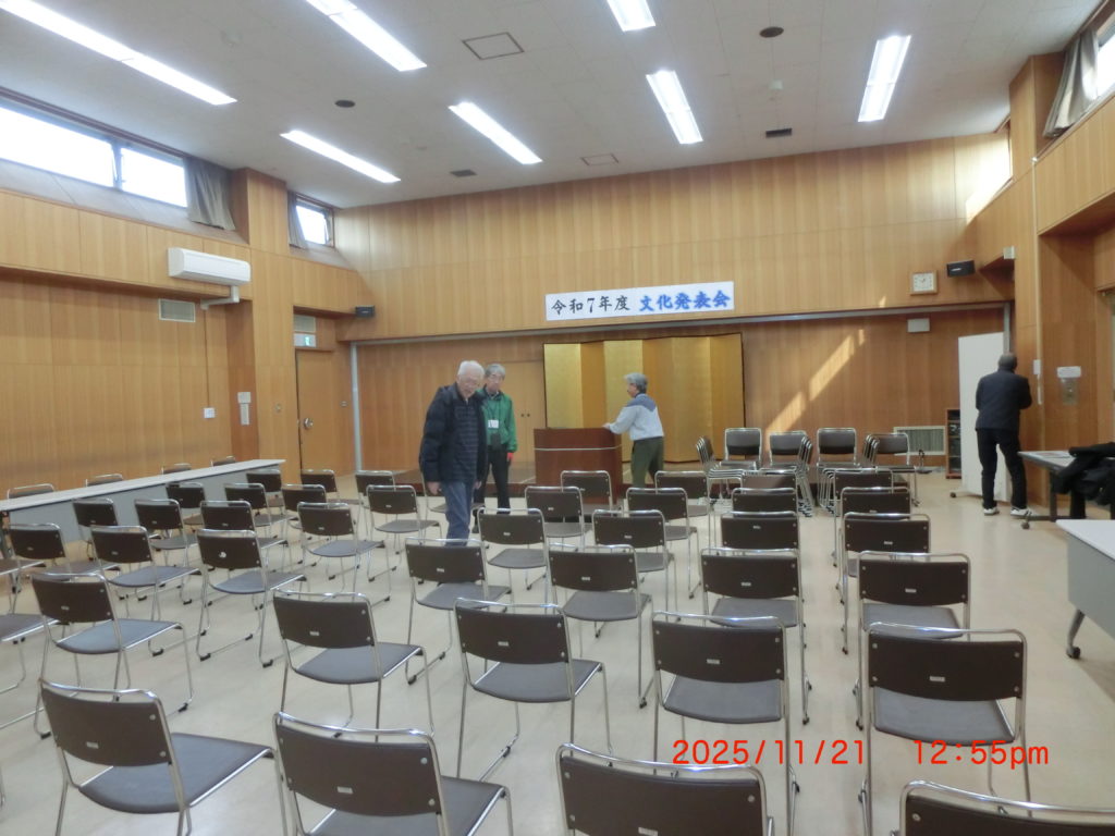 11月21日 明日は2つのイベントがありますので、今日はその準備です。午前と午後に分かれていますが、年寄りには少しきついですね。午前中は文化発表会、大麻東中学校の生徒さんがおなじみの曲を演奏しました。23名の方の演奏はやはりとても迫力がありましたね。アンパンマンの曲は演奏が難しいそうですね。また地区の方の演奏は皆さん1年間の総決算でもありますので、それぞれに味のある演奏をされていました。また来年も参加して、我々を楽しませてください。個人的には毎日のイベント開催で、風邪(インフル)にかかり、その後はねこんでしまった。こんなことは初めてです。動けなくなるきっかけになりました。今日は久しぶりに少しづつ回復している兆し有。