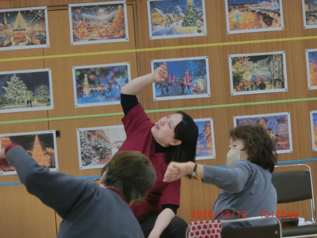12月12日 今年最後の健康体操がありました。あいにくの吹雪でしたので、少し参加者は少なかったのですが、先生の軽快なトークと体操で、皆さん頑張っていましたね。