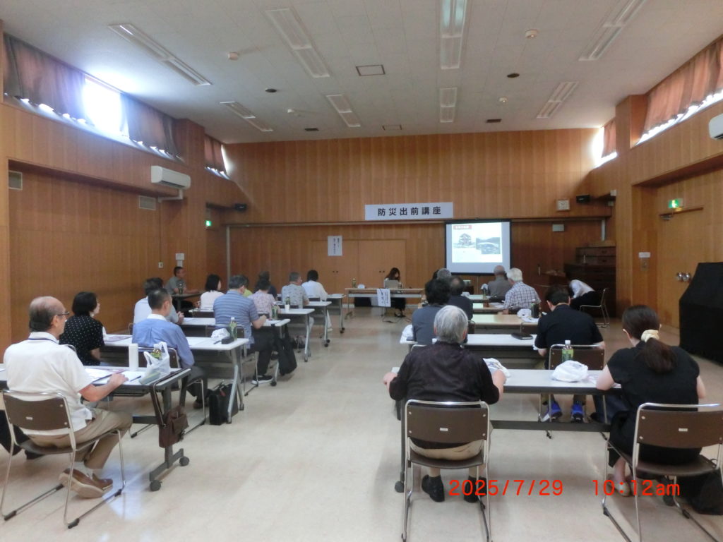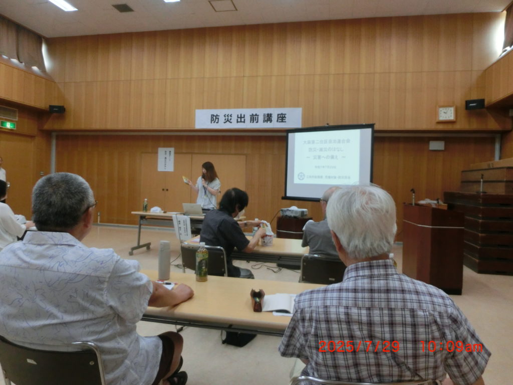 7月29日 江別市の出前講座です。20名くらい参加しました。防災・減災のお話でした。いつもの出張講座で防災についての対策のお話をしていただきました。