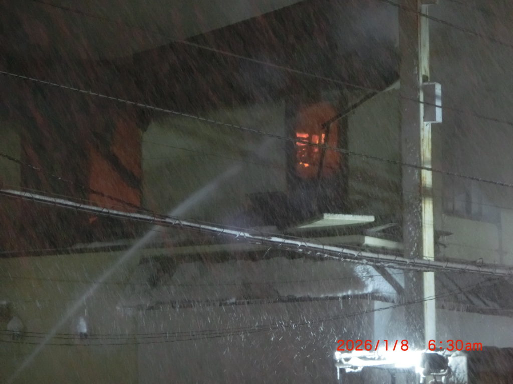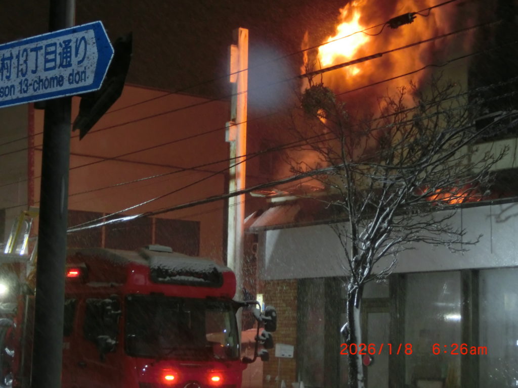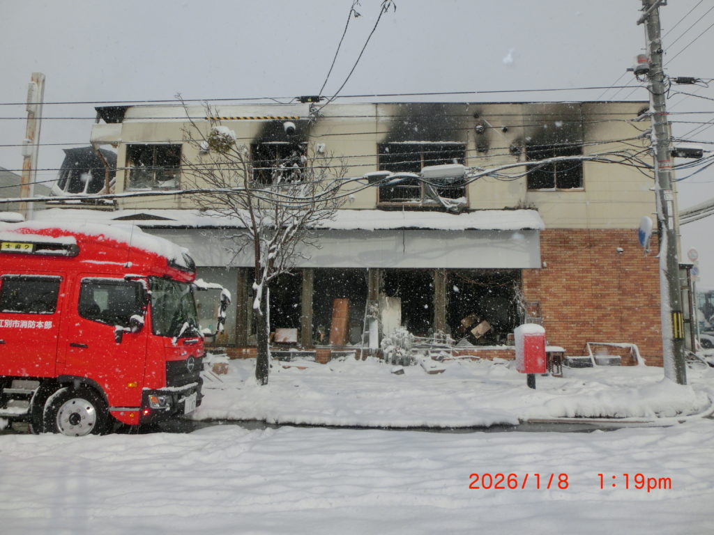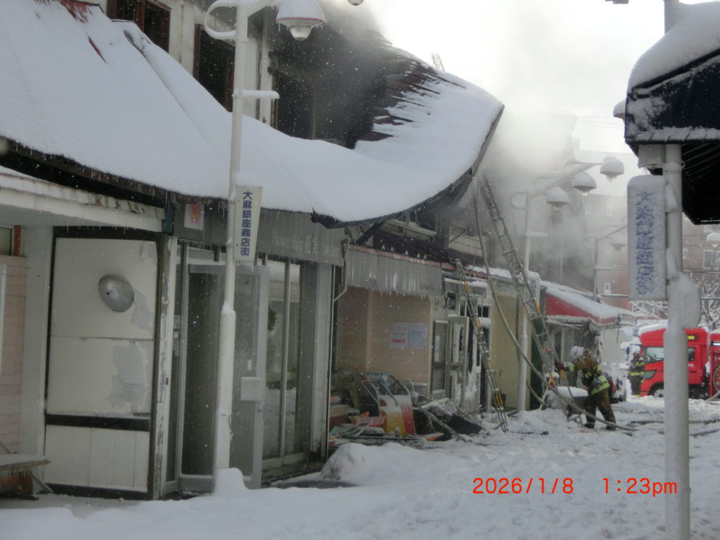 1月8日 今朝は日ごろからお世話になっている大麻銀座商店街の一角が火事になり、今もまだ消火しきれていません。西端の子供のアトリエ、バイク屋さん(火元)、後楽園(焼肉屋)、ヘアサロン(おおさわ)、子供たちの放課後クラブ(みんなの家)、軽食堂(橋本さん)、花美(佐々木)さん、北海道ブック・シェアリング,床屋さん(すみれ)、南裏のアイドールまで延焼しているようです。北側はまだわかりませんが延焼していないようです。6時間以上経過しているそうですが、まだ消火は終わっていないようです。早く消火されることを祈ります。床屋さんの2階はご家族が住んでおられます。また焼肉屋さんの上、2階にはスナックがあるのでしょうか。午後にも様子を見に行きましたが、9つのテナントがほぼ全焼です。1月10日に予定していた「大麻新春交礼会」は中止になりました。
