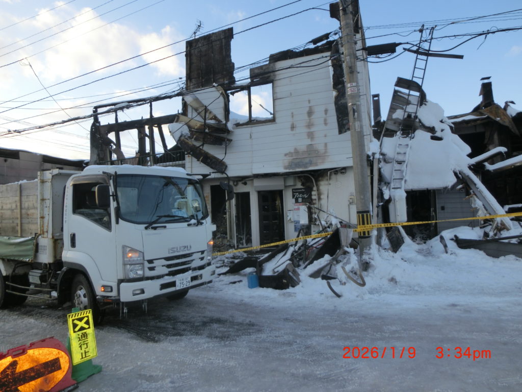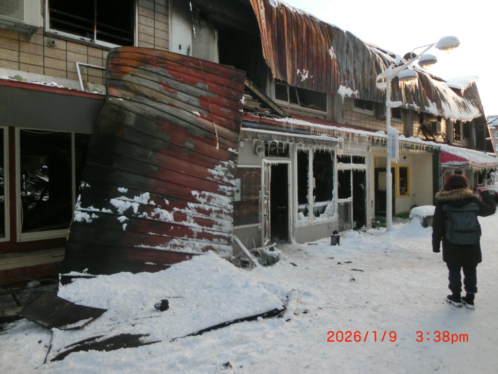 1月9日 商店街の様子です。徐々に悲惨な状況が分かってきました。江別市から東地区センターなど江別市関連施設は無料で使用できるよう指示が出ています。私たちも協力できることがあれば、皆で協力・支援していきたいです。9つのテナントのほかスナックなどもありますので、大火と言っていいでしょう。