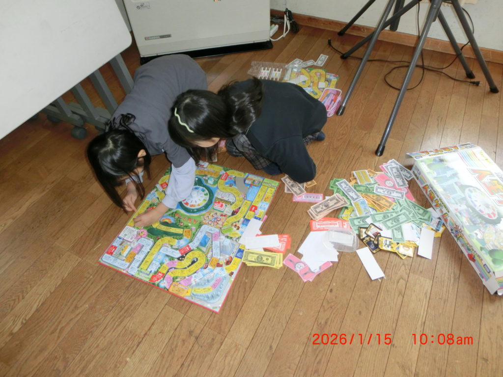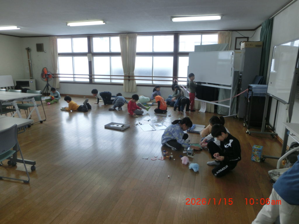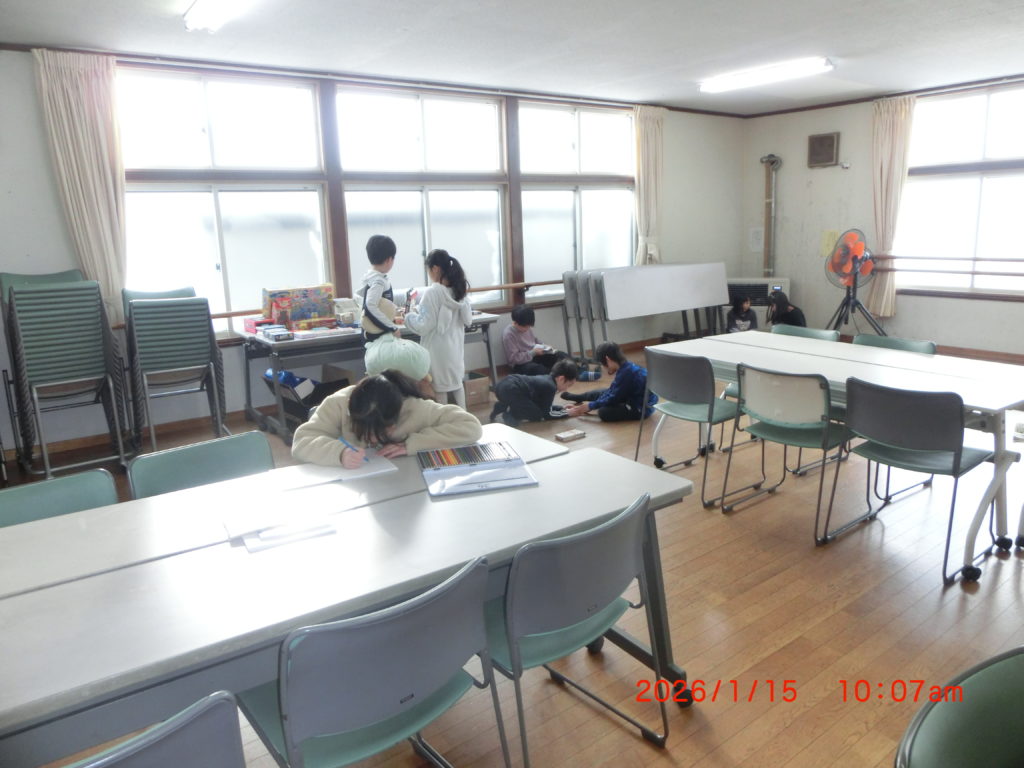 1月15日 今朝から学童保育の児童たちに第二住区会館を無料で開放を始めました。30人くらいは学校の体育館に行っているようですが、ほかの生徒さんはこちらで時間をつぶしています。勉強をしている子はいないみたいですが、ゲーム関係は充実しているようで、板の間ですので、少し寒さは心配ですが、元気いっぱいですね。話しかけてもゲームに夢中で、返事はないですね。学校が始まれば、午後からが基本ですね。