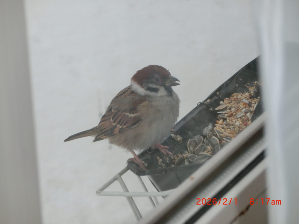 2月1日 最近弱ってきているスズメが窓のエサ台に張り付いています。もう人生の先がないのかと思いますが、エサを食べています。元気になるといいのだけれど、ほかの鳥の迷惑ですね。スズメの最後の時まで見守るしかないですね。(2月3日には来ませんでした)