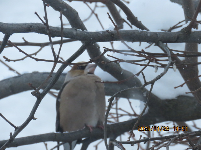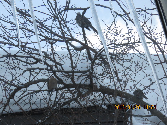 1月26日 毎日雪が降るので、小鳥たちも大変です。今日はシメとヒヨドリが一緒です。なんとなくけん制しているのかな。4,100歩(会議があって自宅から往復、と排雪作業で)