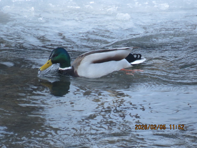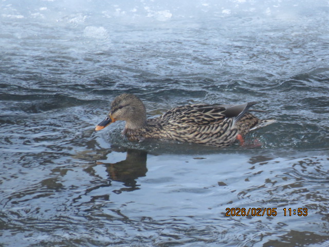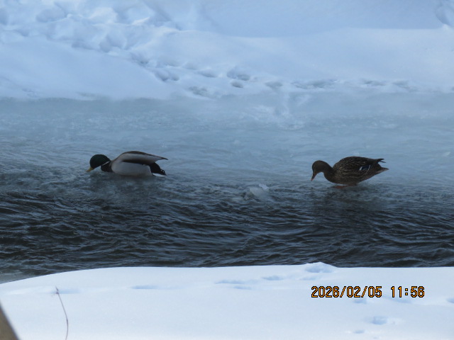 2月5日 今日はちょっと遠くの真駒内公園に行きました。めざすヤマセミは残念ながら見ることはできませんでした。でも冬の真駒内川は氷もありましたが、中央は凍らず流れていましたので、マガモのつがいが川にいました。珍しいですね。氷が張っている上に流れがあって、そこに乗って歩いていました。9,900歩 ついでですが、ヤマセミは真駒内川の下流の方にいるようです。見に行きましたが、いなかった。