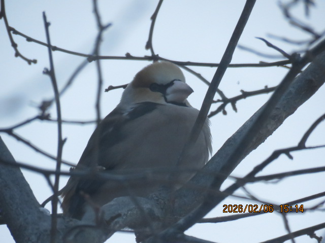 1月19日 自宅の庭にシメが。暗いのでいまいち。ちょっと顔が怖い。2羽いました。午後の1時過ぎにいろいろな野鳥が来ましたね。シメは珍しいです。ウソが来るといいのだけれど。今日はアカゲラは来ませんね。原始林はこの時期はほんとにエサはないですね。住宅街は少しだけエサ不足を補完しているのだろうか。