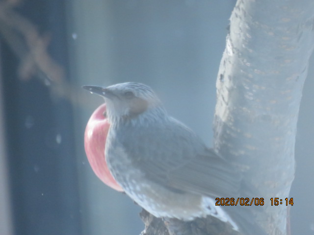 1月21日 今日もヒヨが縄張りを主張しつつリンゴを食べていました。この味を思い出して忘れられないのかな。今日は1羽で来ています。庭の端っこにリンゴを置いたのですが、庭の真ん中でしばらく見張りをしていますので、スズメは来られないですね。この世界では仲よくということはできないのですね。人間世界と一緒だな。人間の頭は鳥並みだね。2月になるとシメはサクランボの芽を食べ始めます。