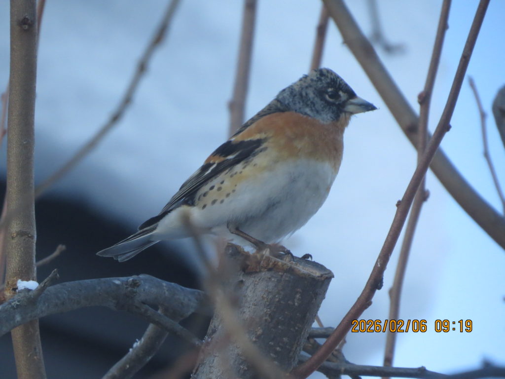 2月6日 自宅にアトリ。冬鳥で、普段は群れでいるみたいだけれど、1羽だけで来ていました。今日はいい天気で温かいので来たのかな。昨日は5畳間の屋根の雪が一斉に落ちたので、今朝は落ちた雪かきをしました。ひと汗かきました。割とオスとメスは似ているそうですが、オスは胸の色が濃いみたいなので、雌かな。