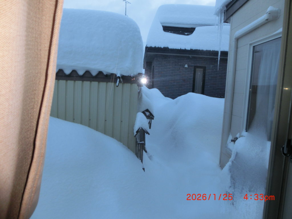 1月25日 今朝からずっと雪が降ったので、大変でした。70㎝くらい降ったかな。日曜なので教会の除雪に行ったのですが、その後もずっと降っていて自宅の前の雪かきで精いっぱい。除雪車が来ないので、車は出せずじまい。3度ほど雪かきしました。